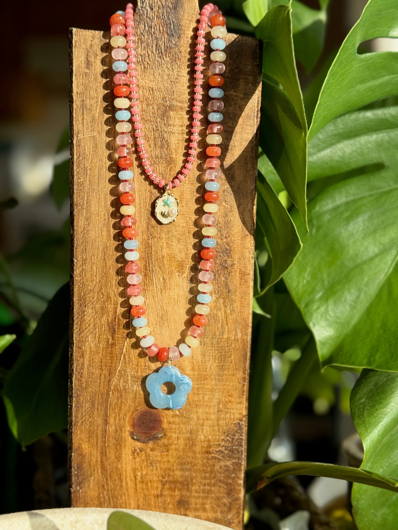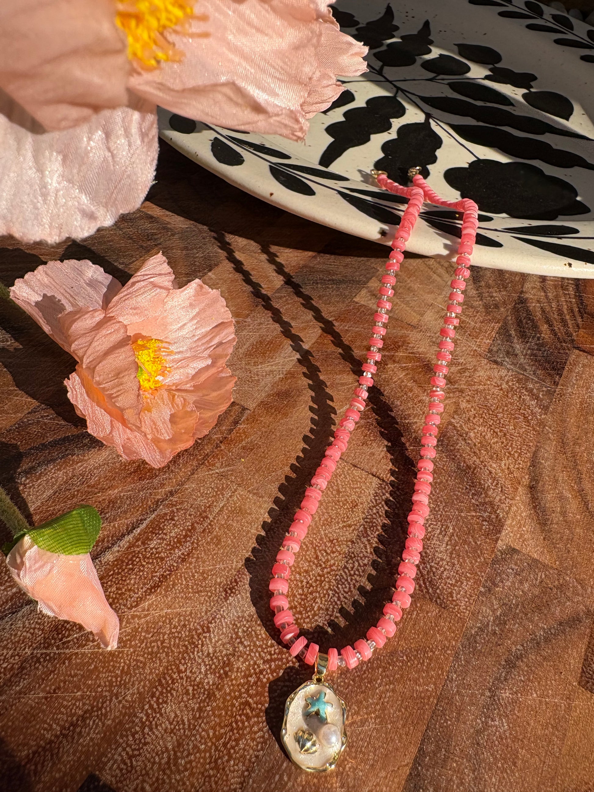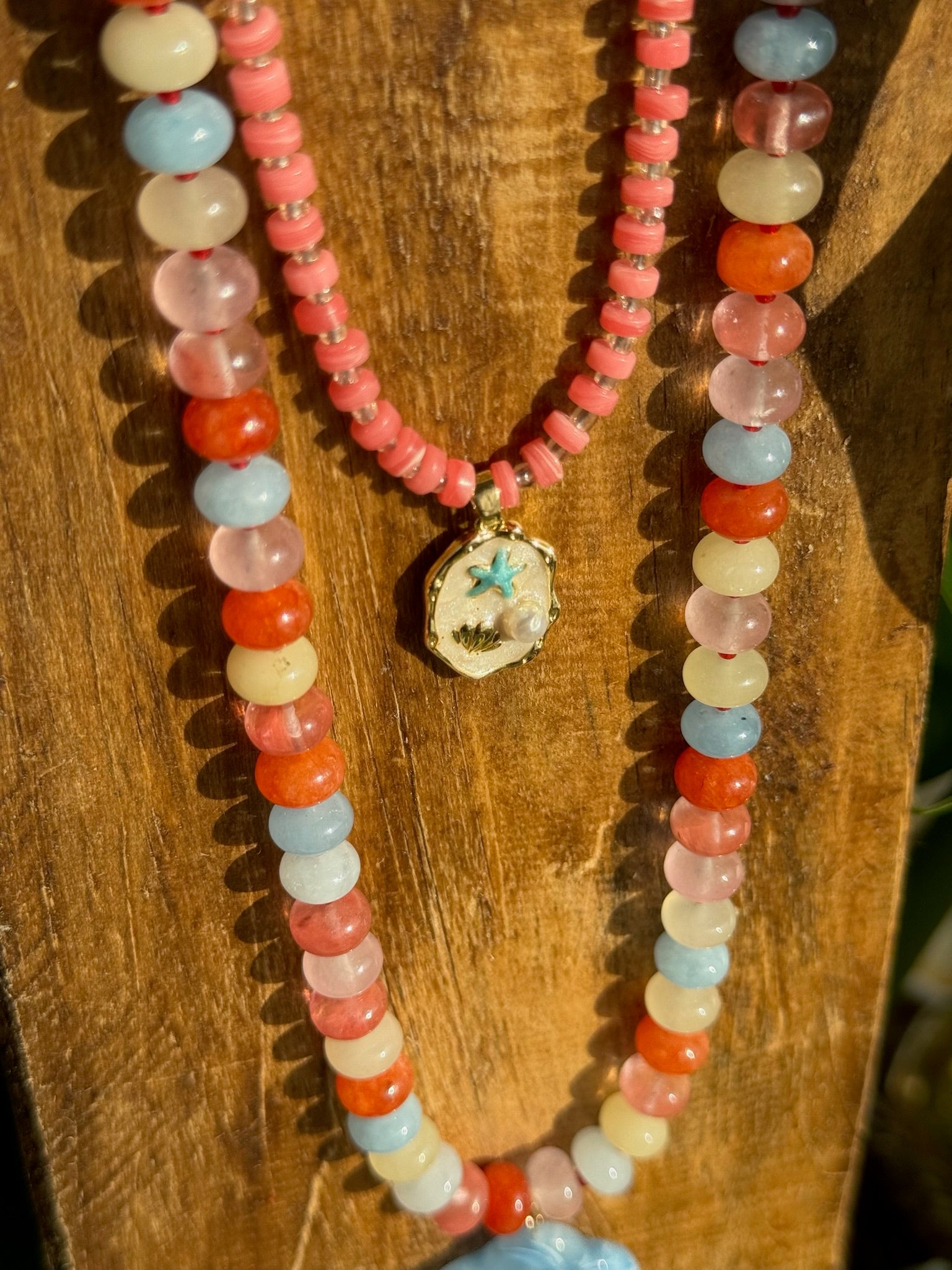 As dreamy as a barefoot stroll through rose-tinted shores, Pink Sand is made with natural rhodochrosite beads in the perfect sun-washed pink. Finished with a seaside charm filled with starfish, shells, and shimmer, it’s a wearable little vacation. Think beach day meets effortless charm.