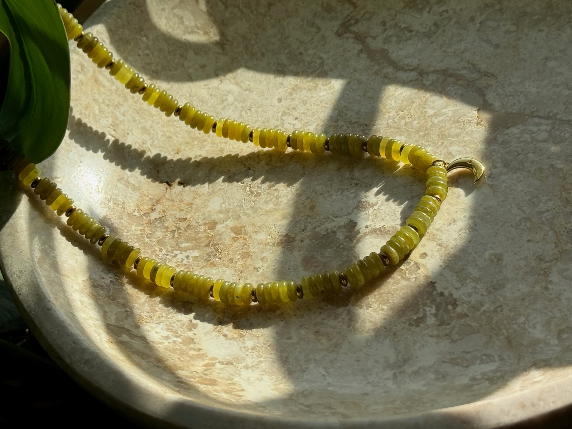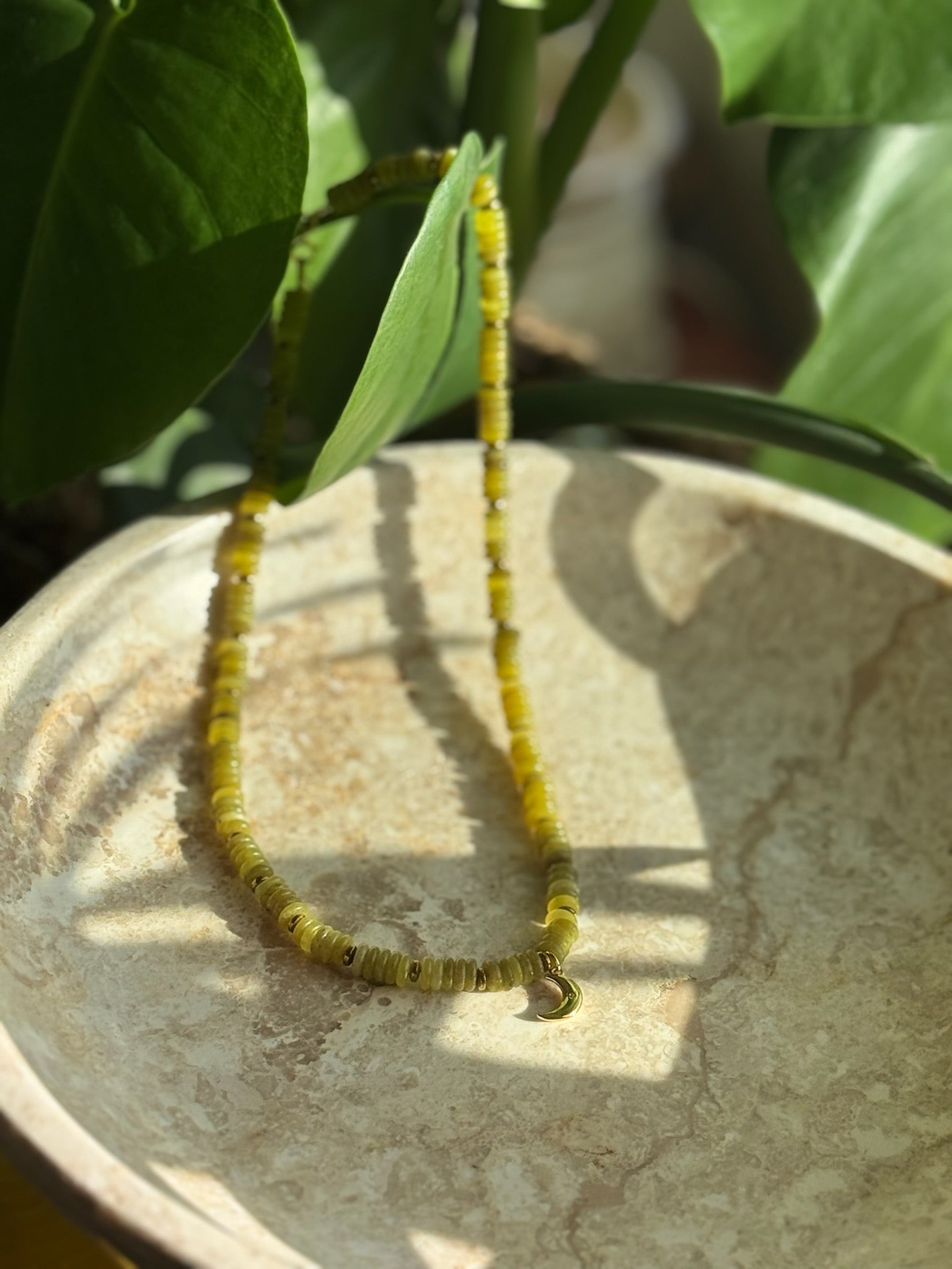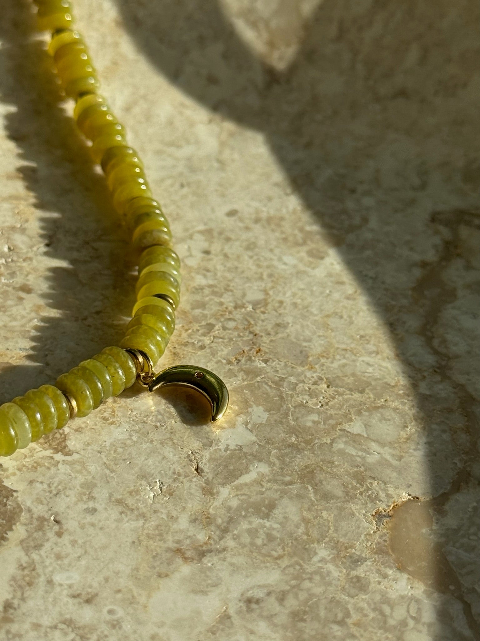 Zesty, golden, and just the right amount of cheeky—Limoncello is your sunshine-in-a-necklace moment. Made with juicy lemon jade beads and accented by a tiny crescent charm, this piece is like wearing a Sicilian vacation around your neck.