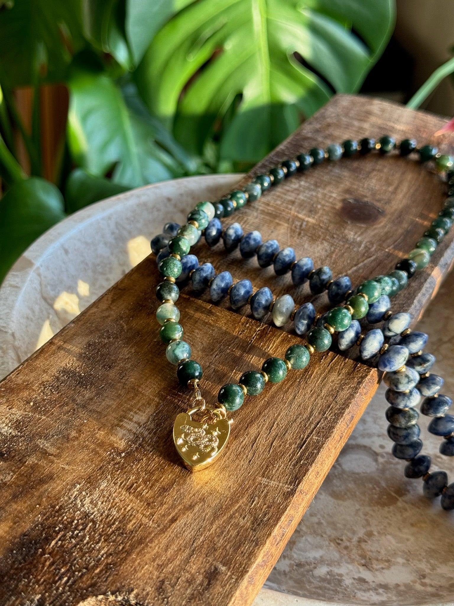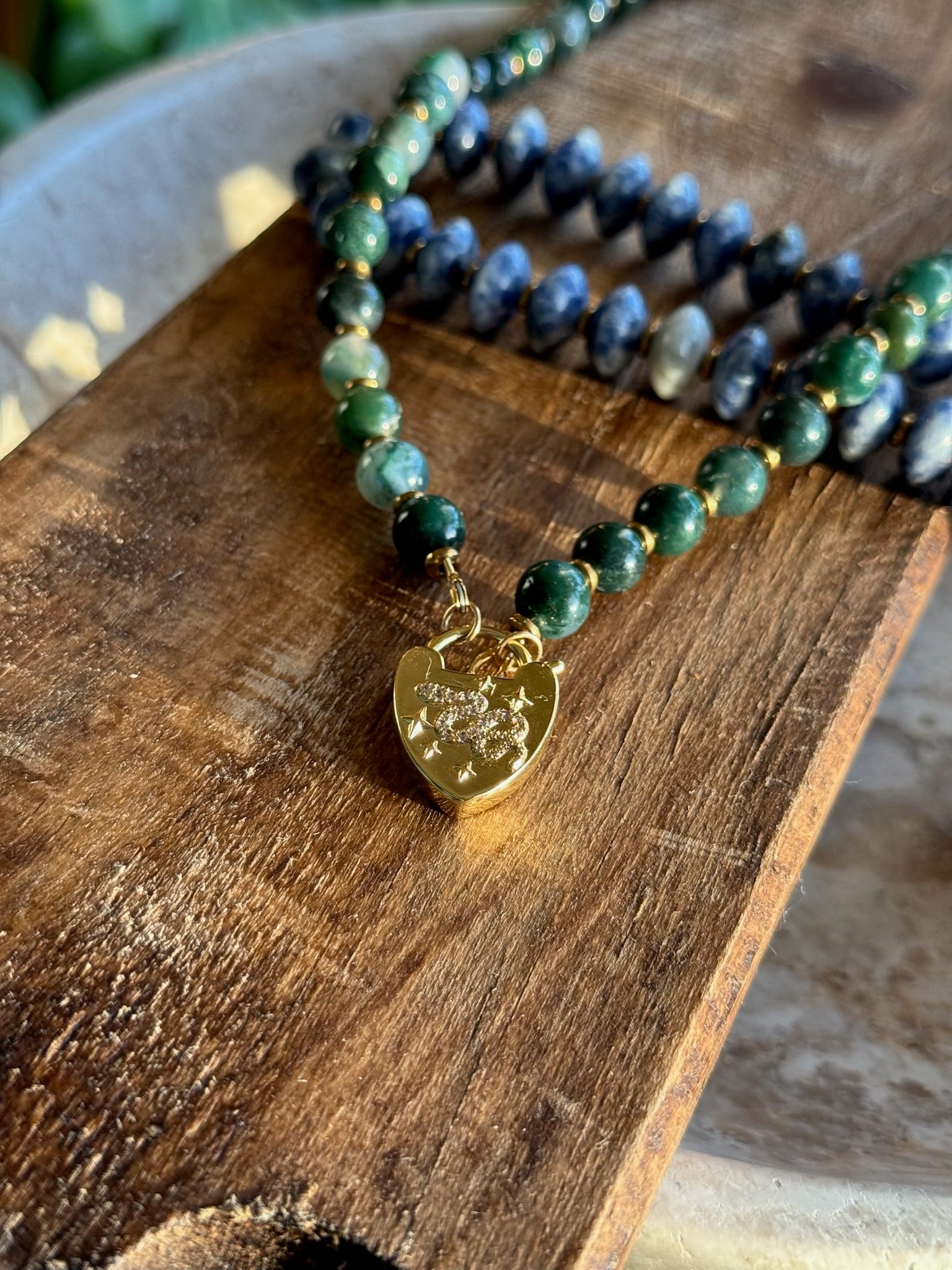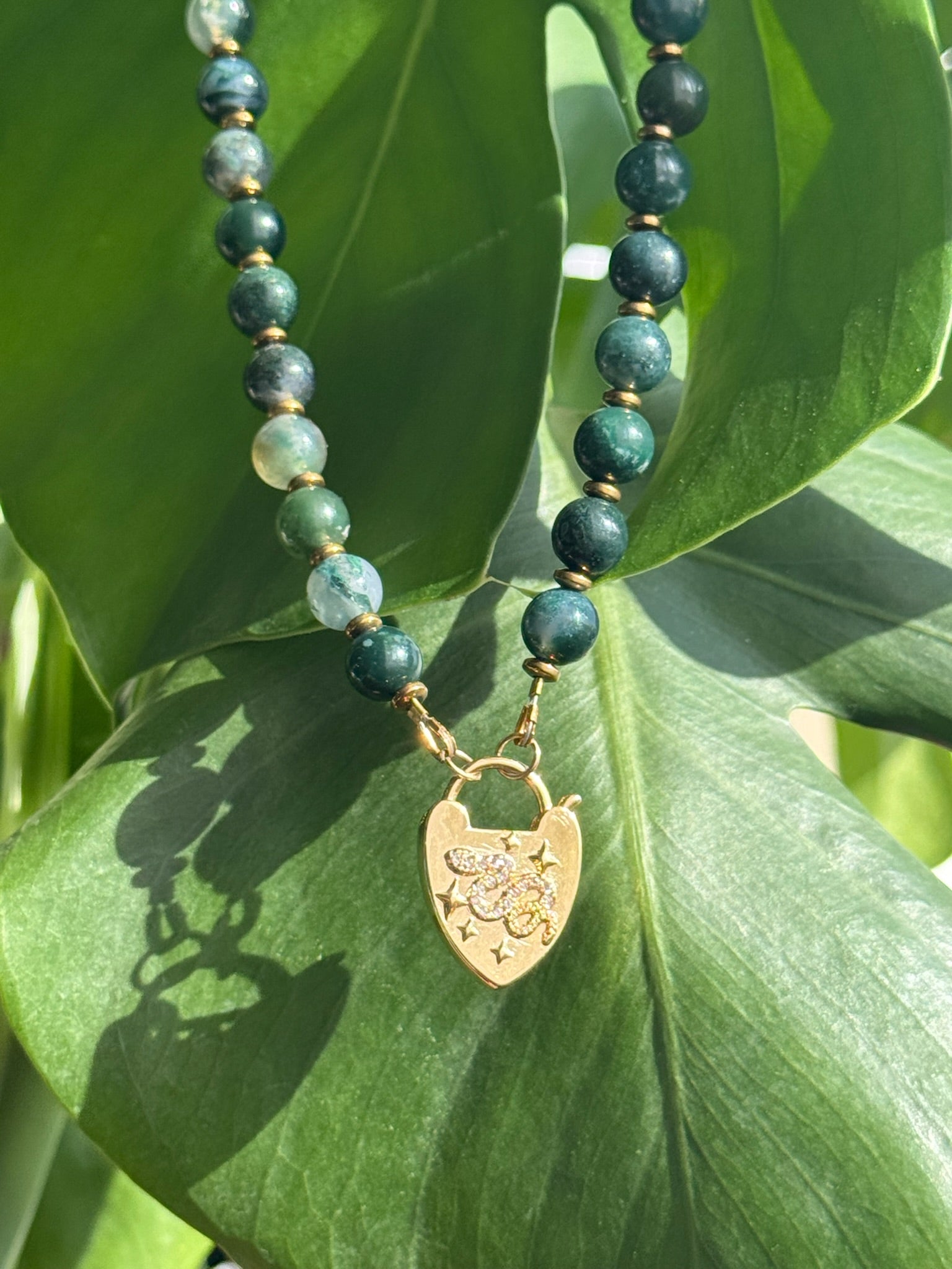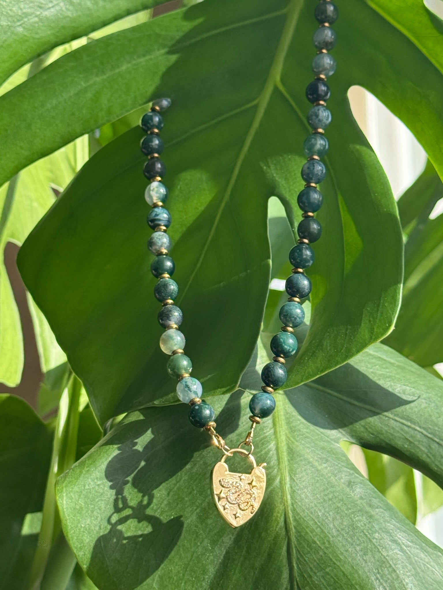 Lush green moss agate beads meet a gleaming gold snake clasp—designed to slither its way front and center as both charm and closure. Garden Snake is earthy, elegant, and just a little bit wicked. A talisman for growth, grounding, and quiet transformation. (No reptiles were harmed in the making of this necklace!)