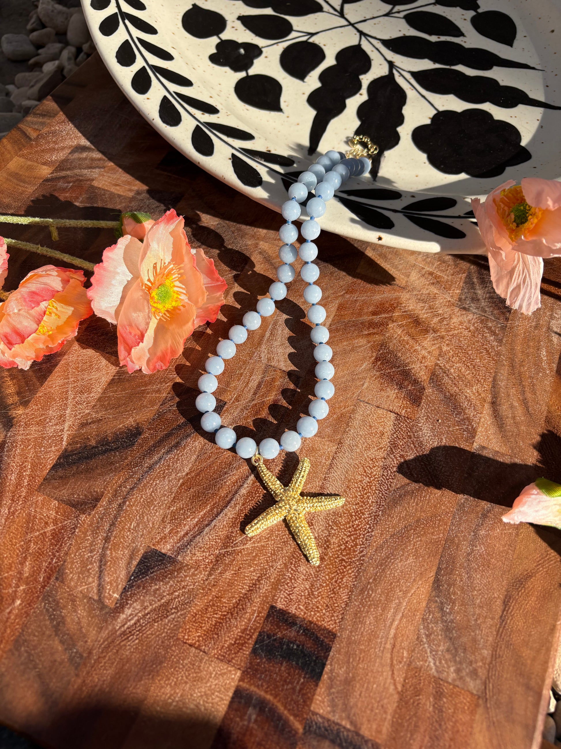 Our Star of the Sea features dreamy blue natural angelite beads that look like they were plucked straight from a mermaid’s jewelry box. Strung with chunky charm and beachy bliss, this bold strand is anchored by a dazzling gold plated starfish pendant—because every outfit deserves a little star power. 💫🐚