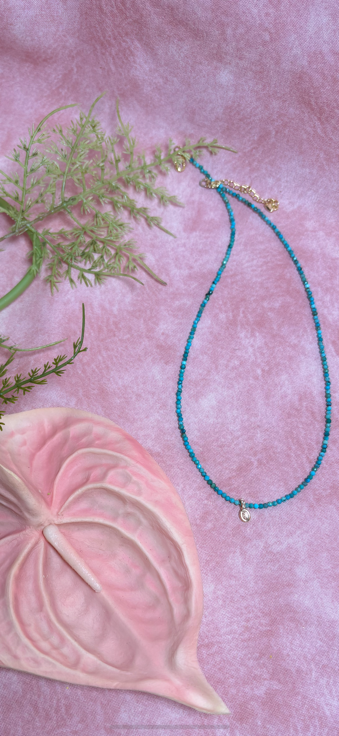 Don’t let her size fool you—Teeny Talisman brings big sparkle and even bigger energy. Strung with micro-faceted genuine turquoise beads that catch the light like nobody’s business, this delicate beauty is finished with a tiny bezel-set charm that adds just the right touch of shimmer.