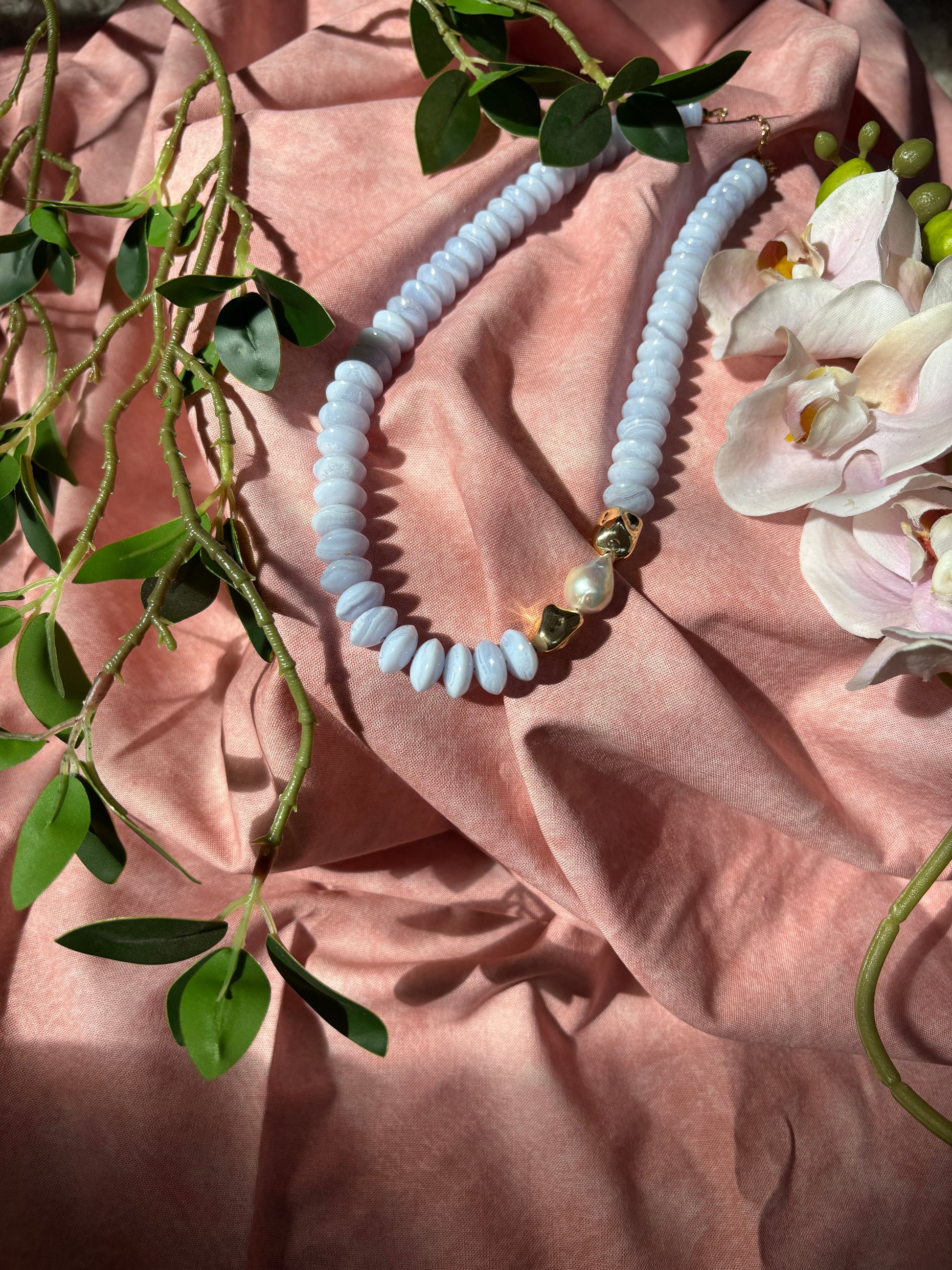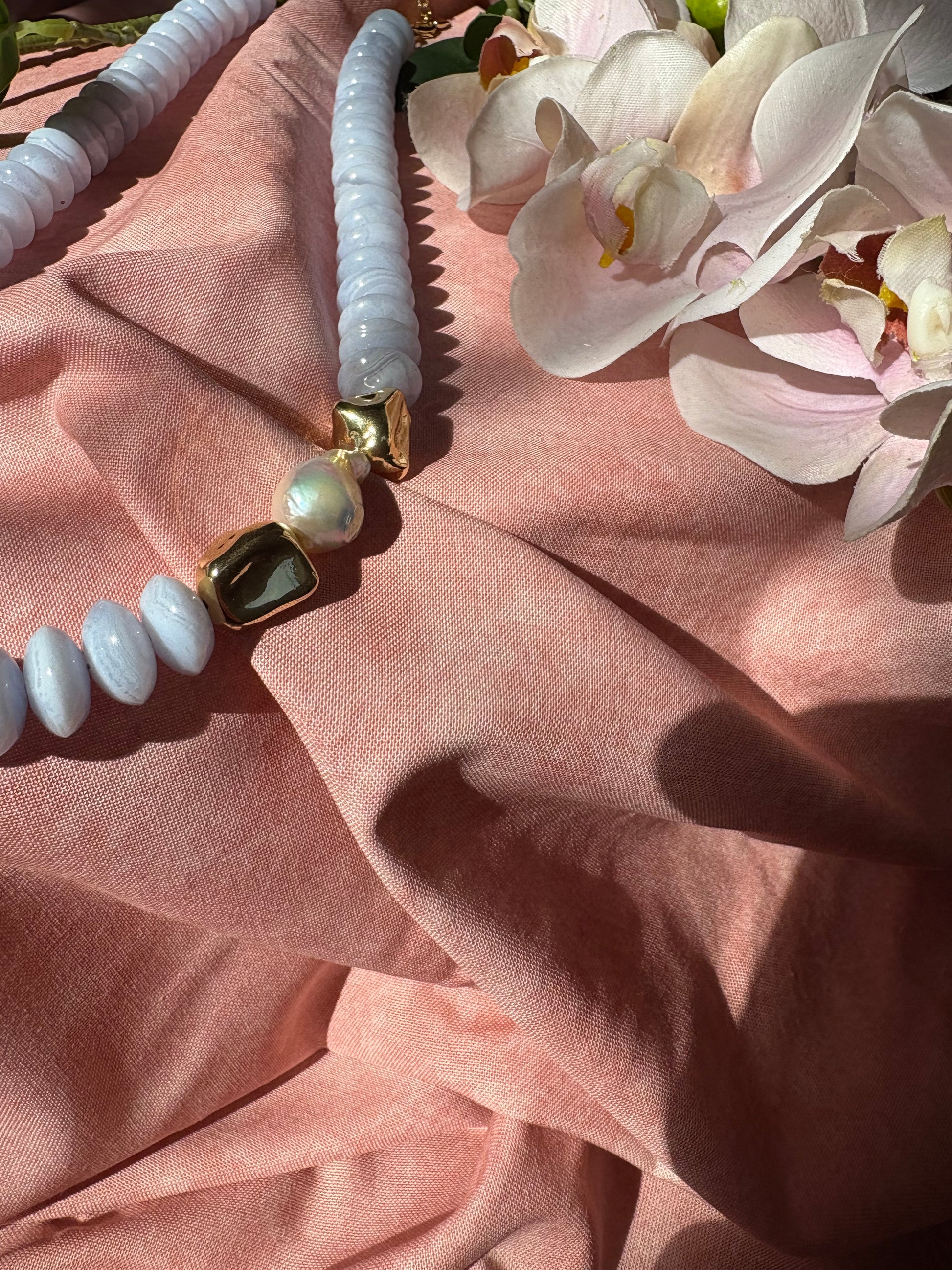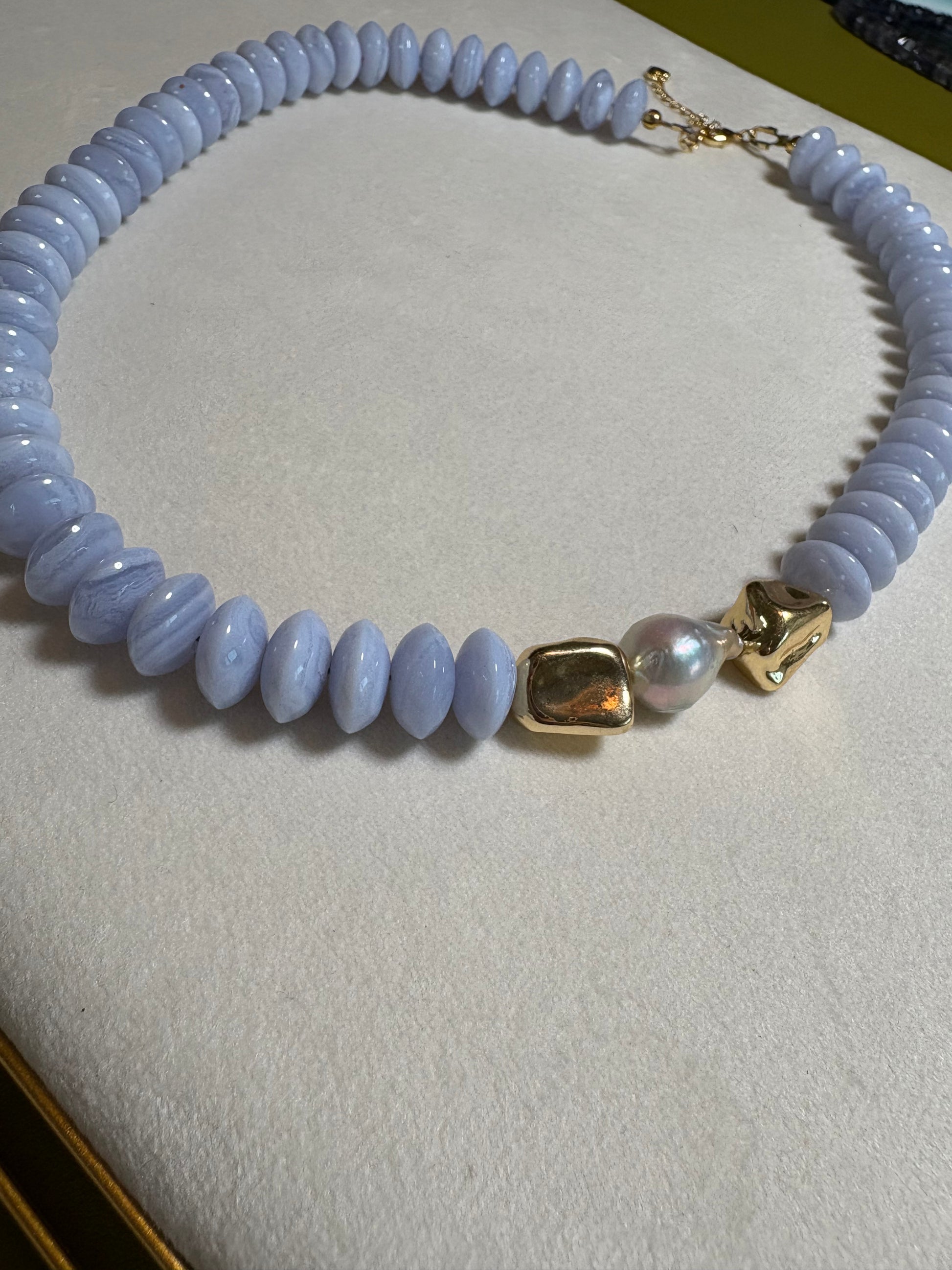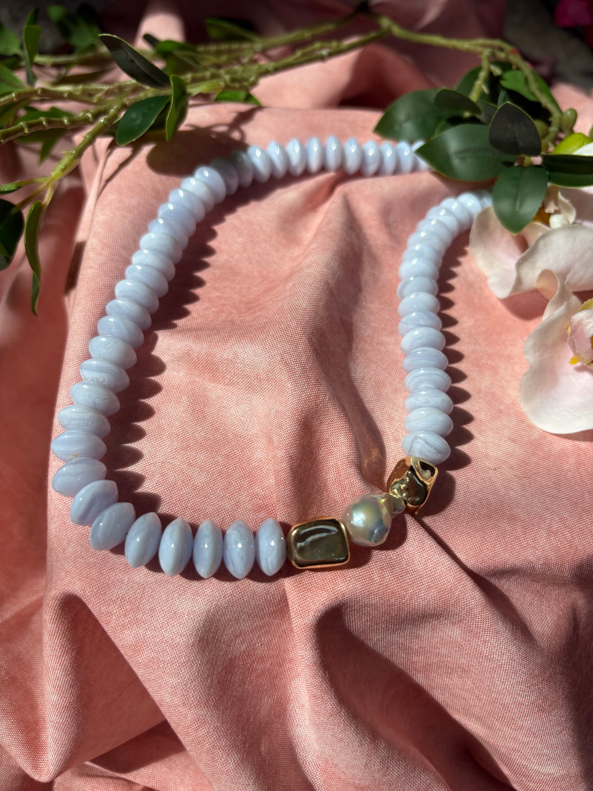For the dreamers with their heads in the clouds and their style turned all the way up—we present The Cloud Chaser. This chunky stunner features glossy blue lace agate beads that look like the sky got jealous of your neckline. Two bold brass nuggets and one sassy freshwater baroque pearl crash the party, adding a little glam drama to the mix.